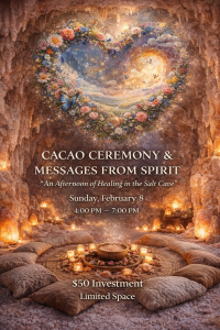 Join us for an afternoon of healing and messages from Spirit. Our Sacred Sacrament is the Medicine of Cacao offering a gentle embrace as her medicine inside the Salt Cave with Wanda. The group will join as a community in order to create sacred space and welcome in loving spirits in order to guide our journey. Come with an open heart and an open mind.